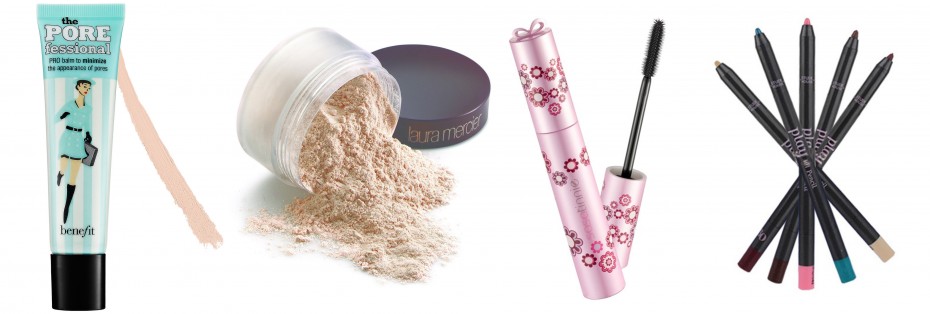 (Left-right) Benefit Porefessional Primer, Laura Mercier Translucent Loose Powder, Sasatinnie Party Queen 4D Hot Lash Mascara and Etude House Play 101 Pencil.