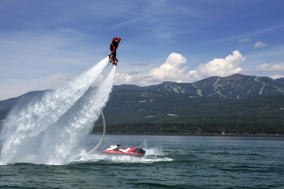 The rider stands on a board connected by a hose to a jet-ski. The propulsion from the jet-ski forces water out of the nozzles that are under the board and propels the rider up to 15m in the air.