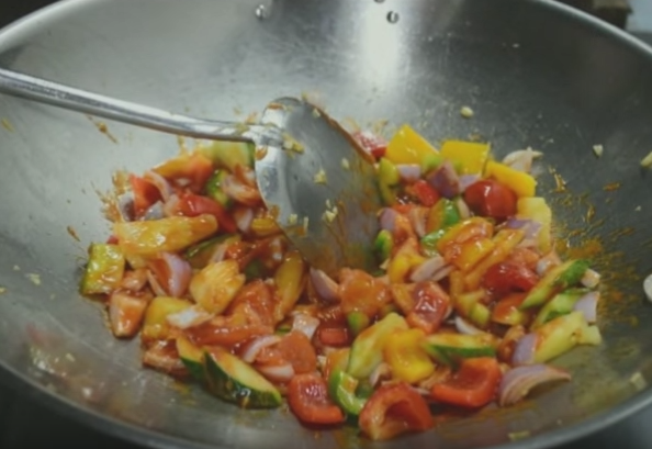 Serve with crunchy lettuce and garnish with red and yellow capsicums.