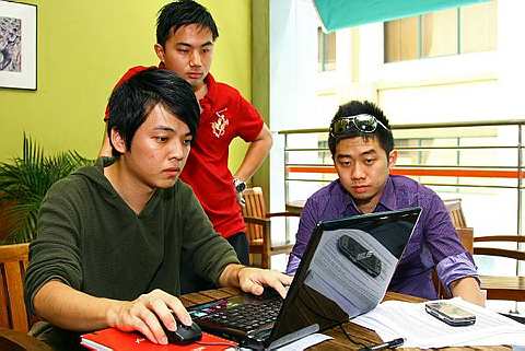 Jian Goh works his magic on the computer while Tan wai Kit (second from left) and Ernest Ng (first from right) looks on.