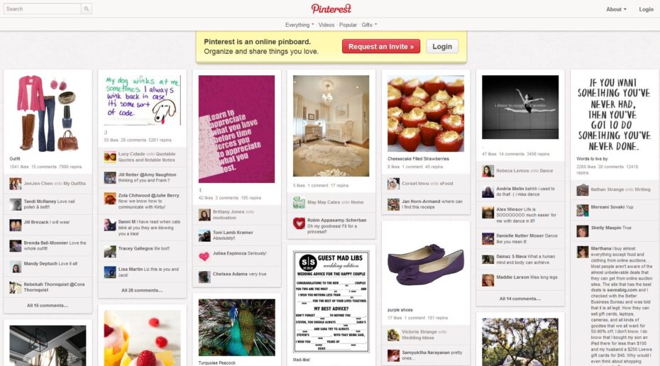 But Pinterest … well Pinterest fills a more specific niche. Remember those cork pinboards at school or in the office where you put up notes and posters mostly to remind you of things? Think of Pinterest as the virtual version of that – instead of sticking up a piece of paper, you’re posting a link and picture to somewhere on the Internet.