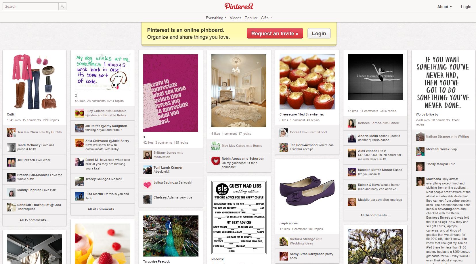 But Pinterest … well Pinterest fills a more specific niche. Remember those cork pinboards at school or in the office where you put up notes and posters mostly to remind you of things? Think of Pinterest as the virtual version of that – instead of sticking up a piece of paper, you’re posting a link and picture to somewhere on the Internet.