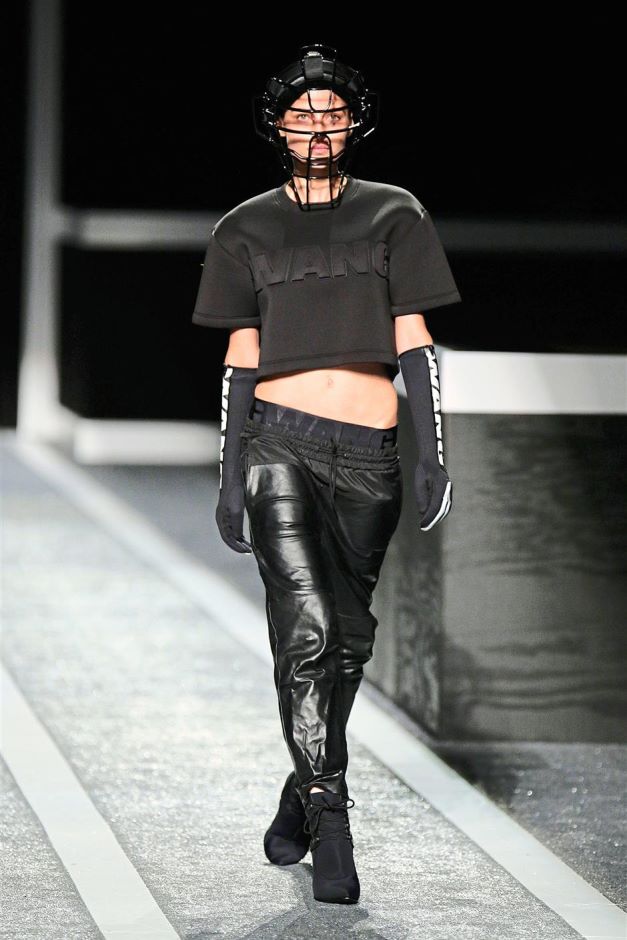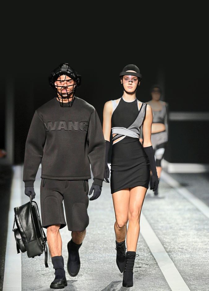 The scene for the fashion show in New York stayed true to Wang’s penchant for basic black, with athletic touches like giant foam boxing gloves for the audience to wave, as well as Team Wang and Team H&M athletic tanks as a nod to the collection’s sporty theme.