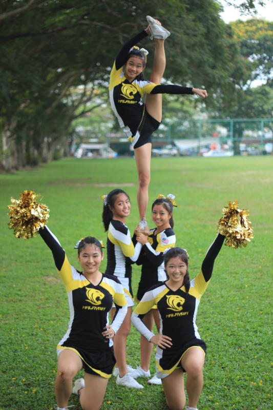 The Team Malaysia cheerleaders participating in Cheer 2013 are Hui Shuen Yee, Rachel Lu, Ong Wei Lee and Renatti Kong-Yueq from team Cyrens (SM Sri Kuala Lumpur), and Theng Kai Yee from SM(J)K Katholik.