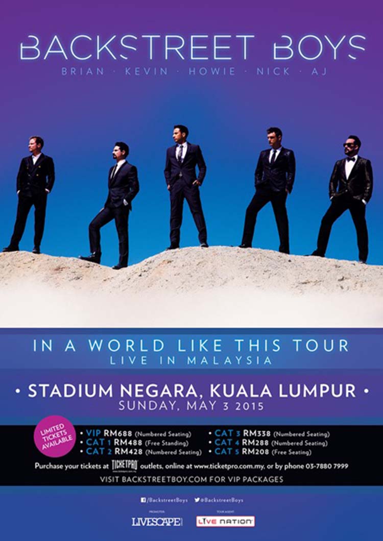Backstreet’s back, alright! Kevin Richardson, Brian Littrell, Nick Carter, Howie Dorough and A. J. McLean, or better known as the Backstreet Boys, are set to perform at Stadium Negara, Kuala Lumpur on May 3.