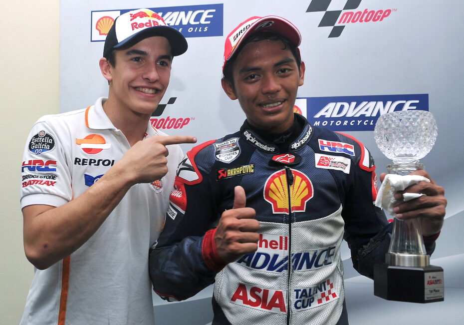 Shafiq’s idol, current MotoGP world champion Marc Marquez (left), took time out to congratulate Shafiq on his success.