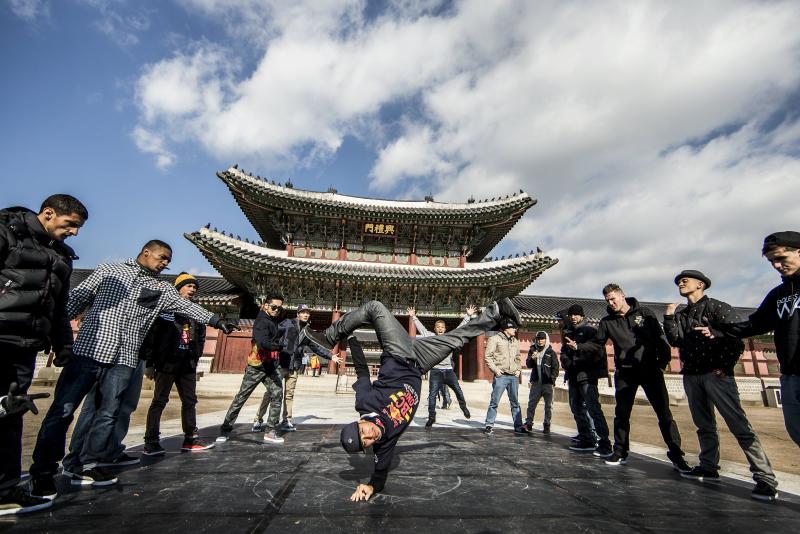 Best of the best: The 16 finalists of the Red Bull BC One world final having a little cypher at Seoul’s Gyeongbok Palace ahead of the competition. Showing his moves in the middle is b-boy RoxRite, who has won more solo competition than any b-boy in the world
