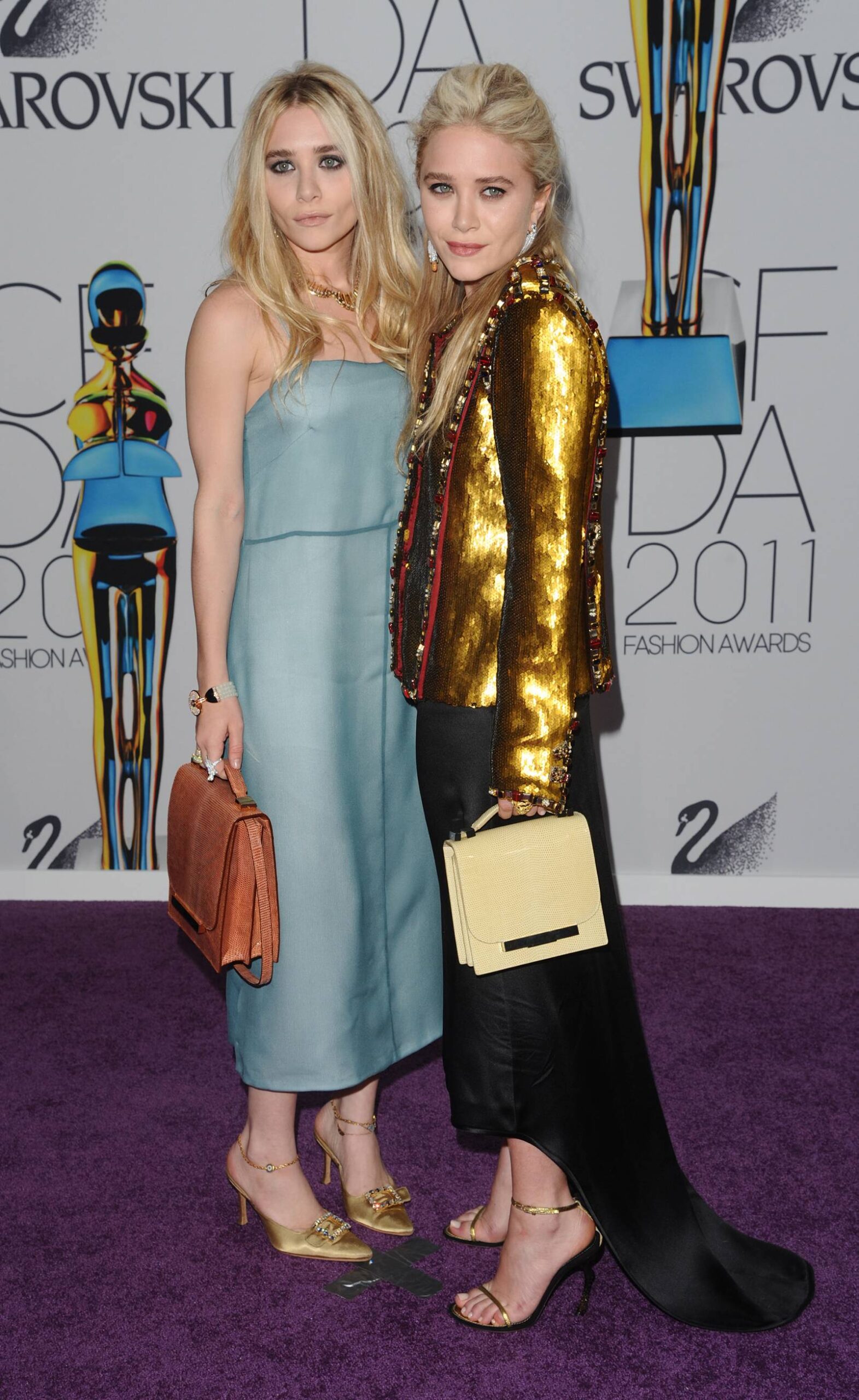 Ashley Olsen (left) in a long blue dress by The Row, and Mary-Kate in a golden Chanel jacket and a black skirt by The Row