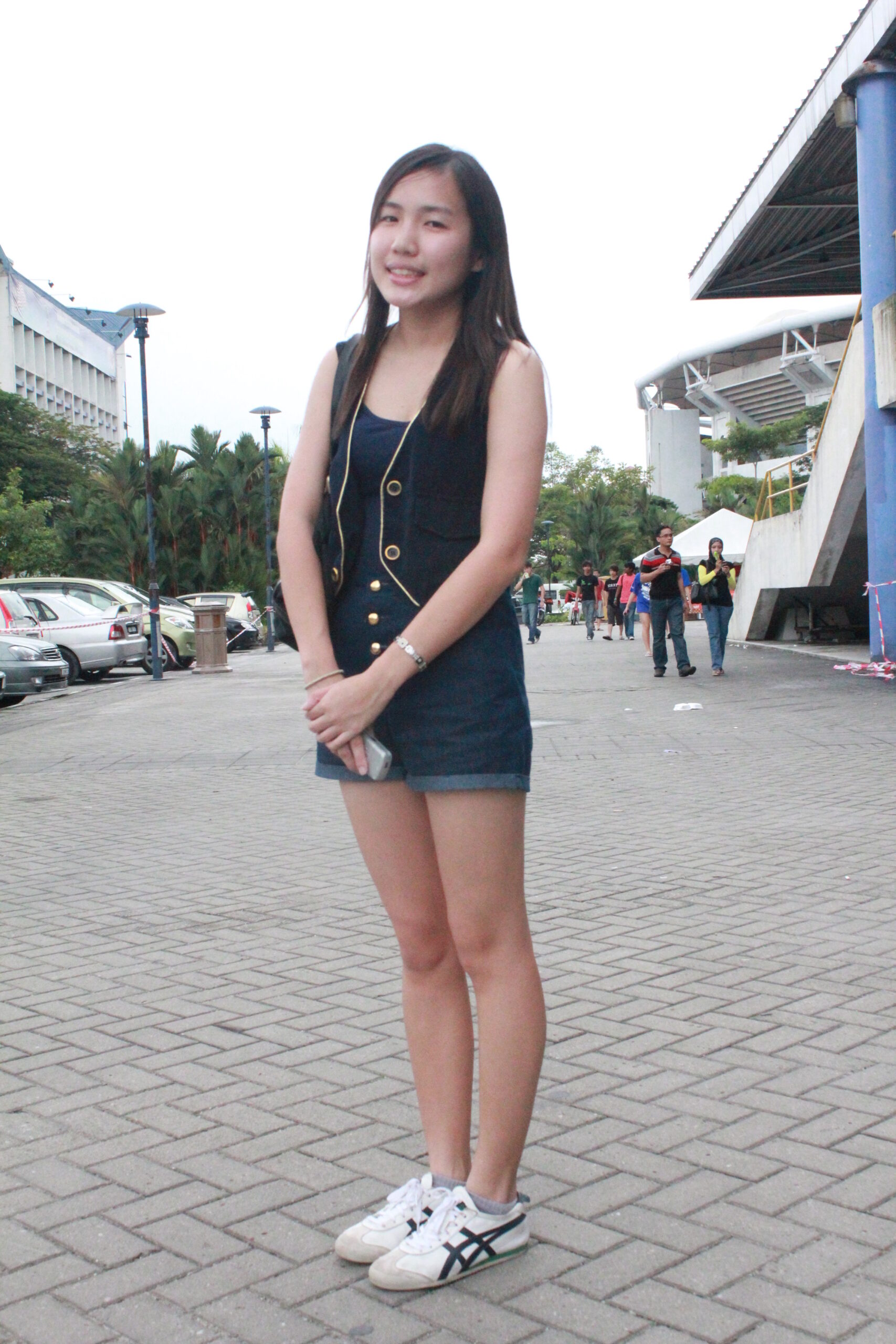 Carmen Woon mixes and matches well with this ensemble of dark blue pieces, finishing off the look with Onitsuka Tiger sneakers