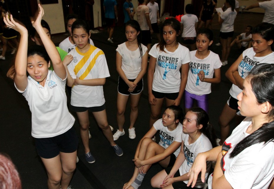 Coach Lim Cheng Choo (left) showing cheerleaders how to hold a flyer’s shoe during training.