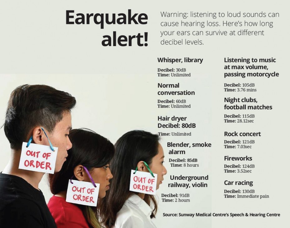 In Malaysia, noise levels at clubs can be incredibly loud (up to 115dB, the same as a concert), which means partying it up every Friday night from 11pm to 3am could be putting your poor ears at risk. Why? Because when sound levels are at 115dB, you should only be there for 28 seconds!