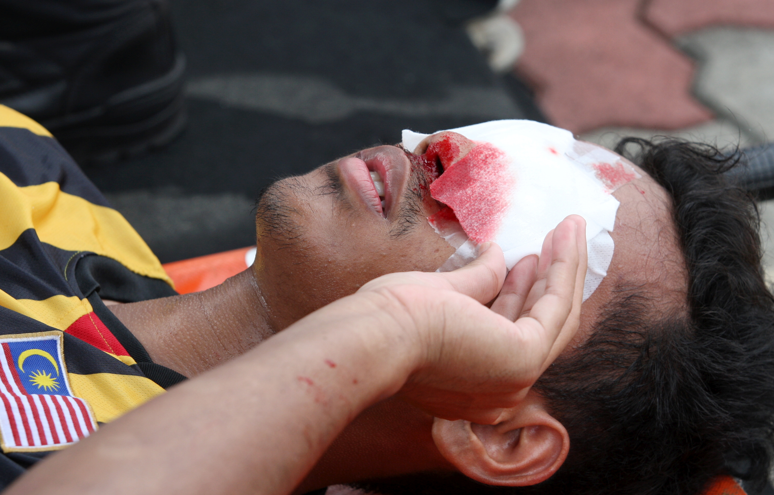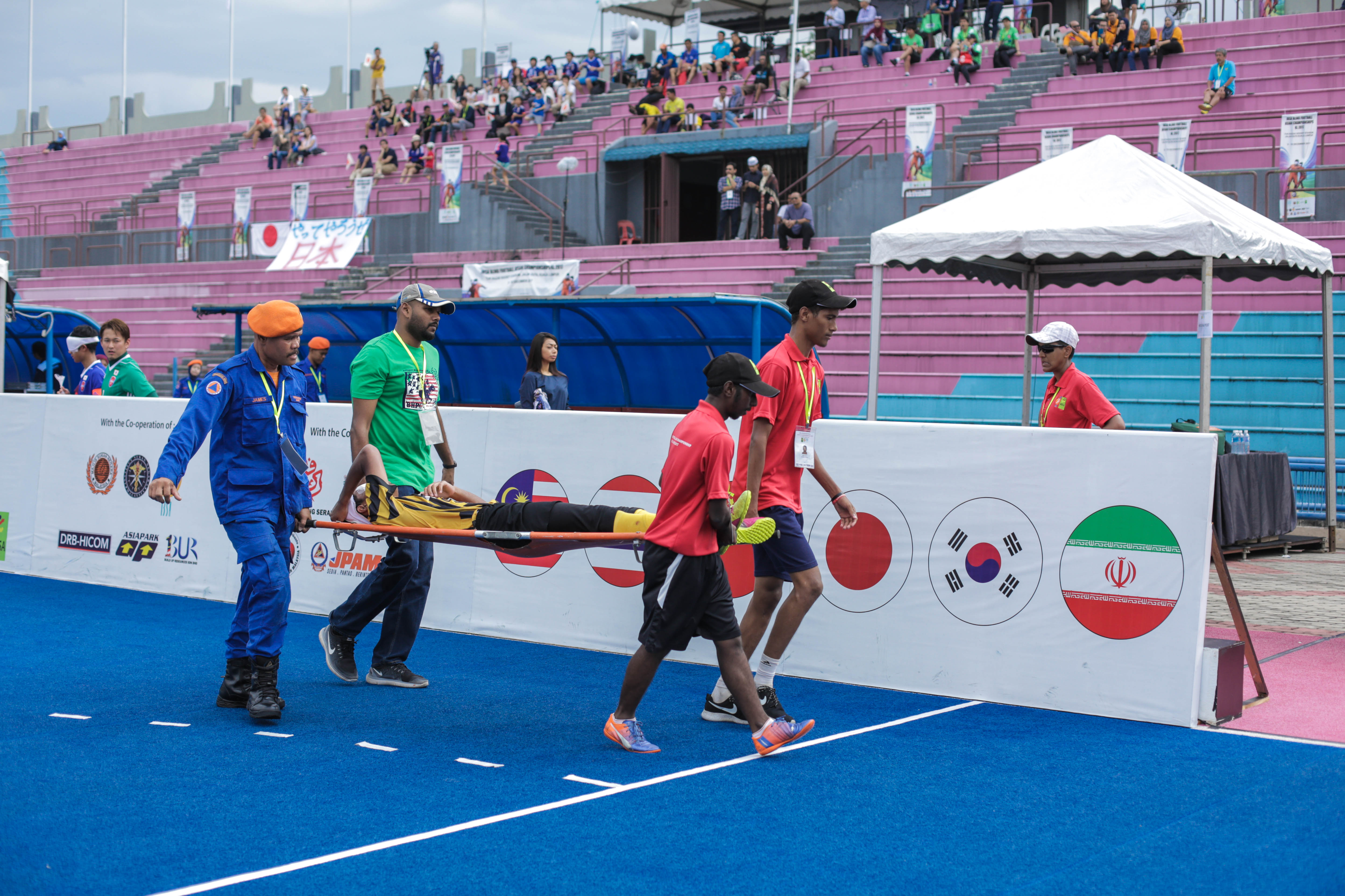 Football is dangerous; blind football even more so. Striker Ahmad Fikri Omar had to be carried off the patch after a head-on collision with a Japanese player. Blind footballers are regularly at risk of such contact injuries when they play.