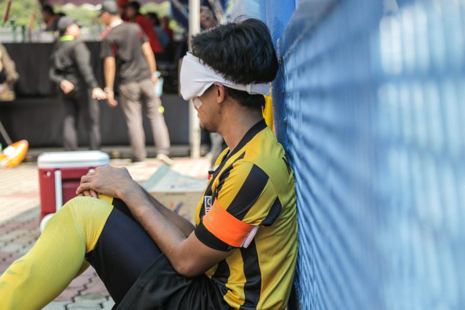 Football is dangerous; blind football even more so. Striker Ahmad Fikri Omar had to be carried off the patch after a head-on collision with a Japanese player. Blind footballers are regularly at risk of such contact injuries when they play.