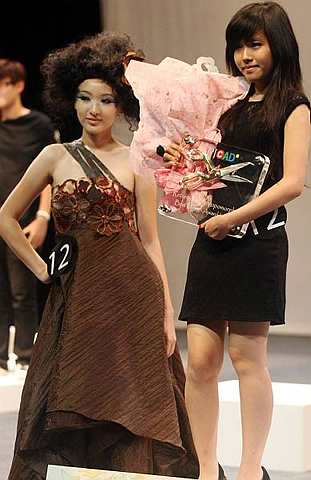 Matilda Low (right) and the dress that won her the ‘Best Design’ award at PJCAD’s Graduation Fashion Show last Saturday.