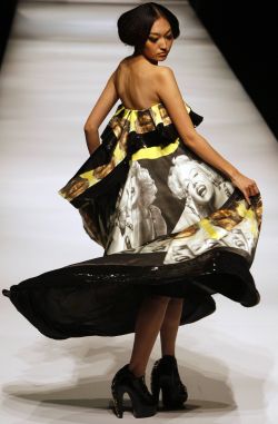 Designers and siblings Wu Xuewei and Wu Xuekai have put multiple pictures on their multi-tiered dress, which is pretty funky if worn to the right event.