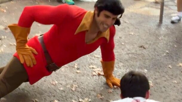 At Florida’s Walt Disney World, Beauty And The Beast’s Gaston single-handedly wins a push-up contest against a theme park goer.