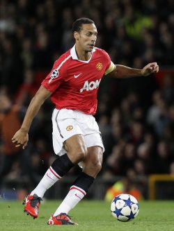 Manchester United’s Rio Ferdinand in action against Rangers during the first leg of their Group C Champions League soccer match, Old Trafford, Manchester, England, Tuesday Sept. 14, 2010. (AP Photo/Jon Super)