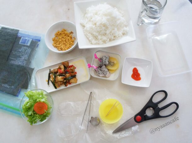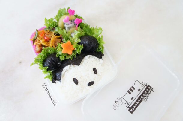 Cut the Nori (dry seaweed) as seen in the video to make the top head, eyes & nose and the ears. Make sure the scissors is fully dry because water and dry seaweed it’s a big no-no.