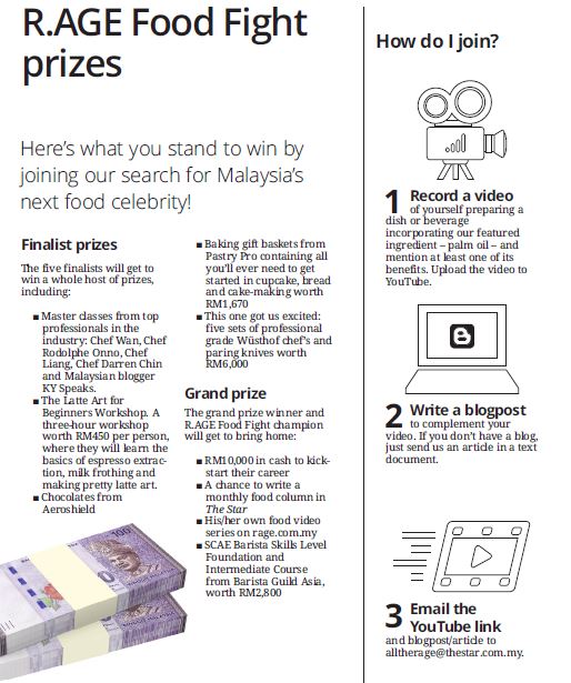 If this all sounds too good to be true, trust us it’s not! But time is running out – the deadline is Sept 27, so get cooking – fast! Those who have already submitted their videos can view them at rage.com.my/foodfight. You can also check out other contest details, full terms and conditions, and interviews with the judges on the website to get an idea of what they’re looking for in a finalist.