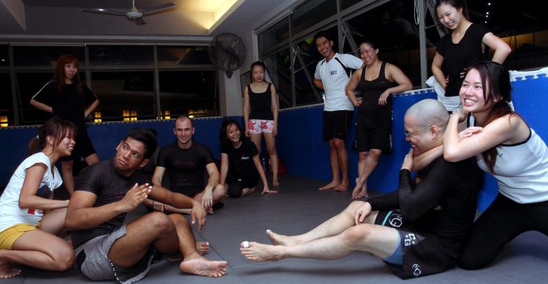 The ladies at the workshop got to practice their jiu jitsu moves on the male students of the Leverage Combat Academy.