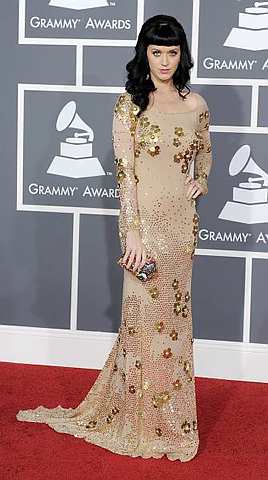 Katy Perry in a nude, floor-skimming, flower-embellished Zac Posen dress.