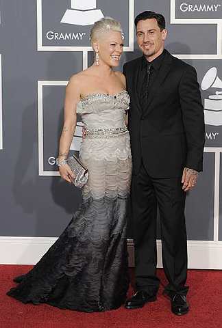 Pink wore a floor-length ombre dress by Tony Ward Haute Couture that faded from light gray to black in delicate scalloped layers, chaperoned by Carey Hart.