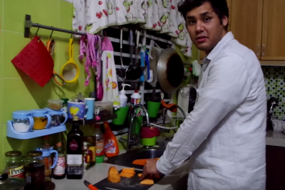 He’s well-known for his super zany YouTube videos, and he co-owns a cafe, so we figured — who better than GRIM FILM‘s Jared Lee to do a demo R.AGE Food Fight video?