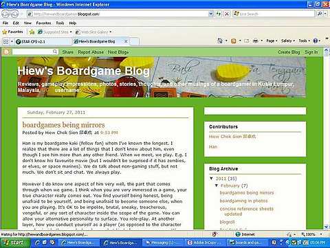 Hiew Chok Sien loves boardgaming, and he’s the author of a home-grown boardgames blog, hiewandboardgames.blogspot.com, as well. He also has a Chinese language blog (hiewchoksien.blogspot.com), which he started late last year.