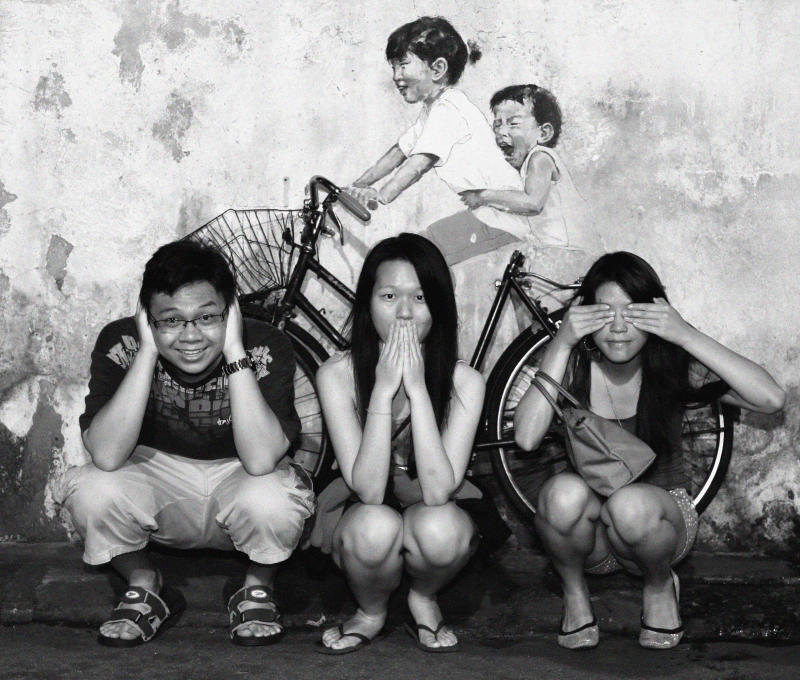 The lighting at the famous mural on Armenian Street is really bad at night, but converting the photo into a black and white image makes it work.