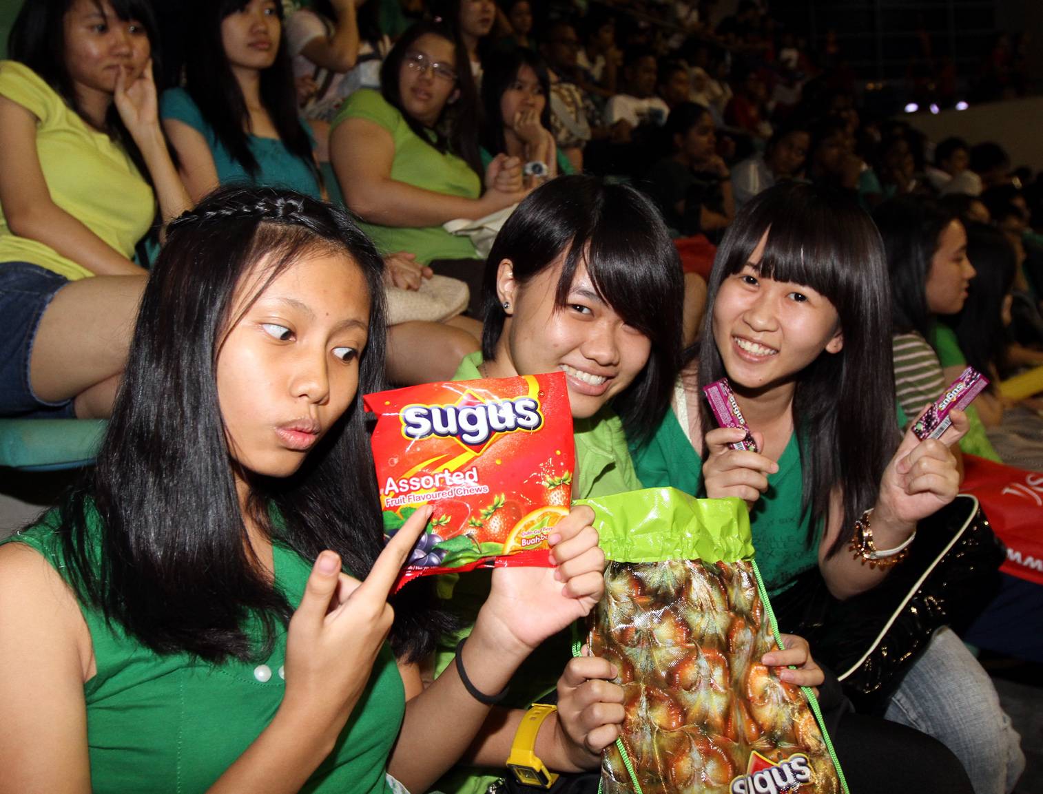 Supporters (left to right) Kathy Chong, Fong Pei Teng and Tan Liang Li enjoying their free goodie bag from Cheer 2012 cosponsors Sugus.