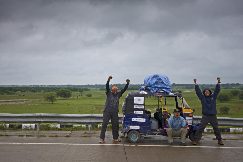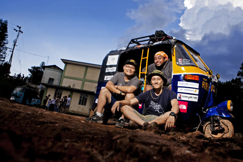 Malaysian photographer Geh Chee Minh (left) and his Singaporean Rickshaw Run teammates Mark Teo (right) and Joe Peter (back)