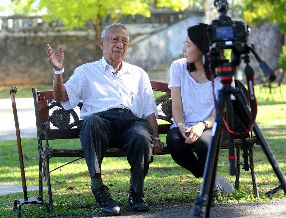 James Jeremiah speaking to R.AGE journalist Vivienne Wong at Fort Conrwallis, Penang. He remembers the screams of torture victims at the Wesley Methodist Church (converted into a Kempeitai office) were so bad, he has not revisited it in over 70 years.