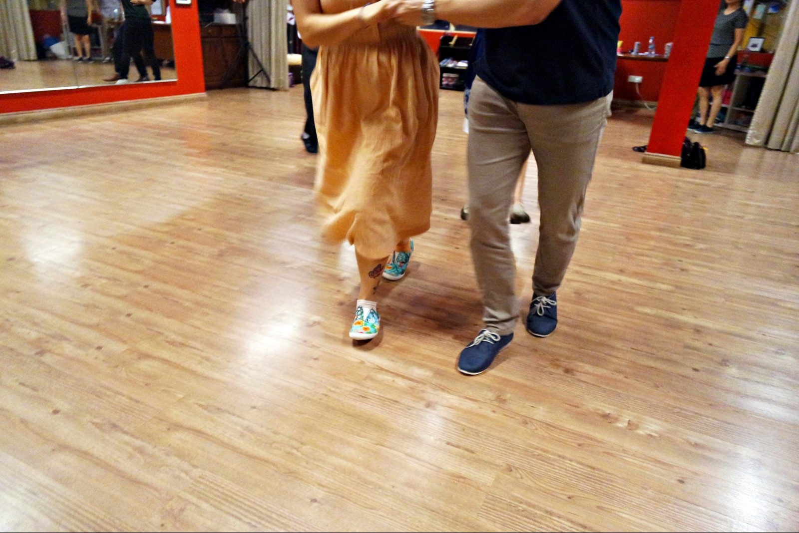 At the taster class, a dozen newcomers are diligently watching the feet of a couple standing in the front.