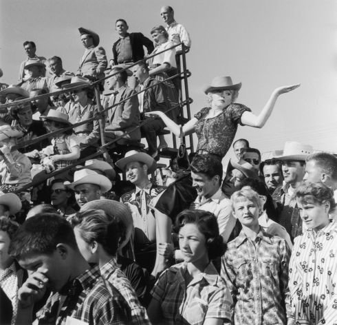 1956: EXCLUSIVE American actor Marilyn Monroe (1926 – 1962) reacts while American actor Don Murray carries her on his shoulder on the set of director Joshua Logan’s film, ‘Bus Stop’. They are surrounded by a crowd in bleachers. Monroe is wearing a cowboy hat, a blouse and a slit skirt.