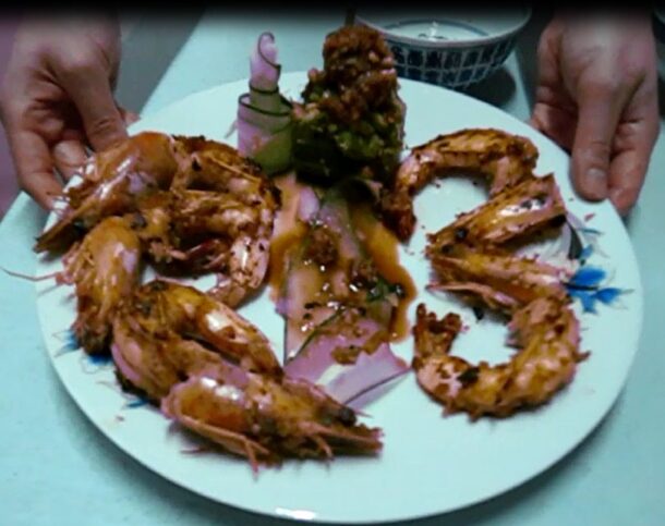 Deveined the prawns and use toothpicks to pin both side of prawn’s body to make crouching tiger prawn.