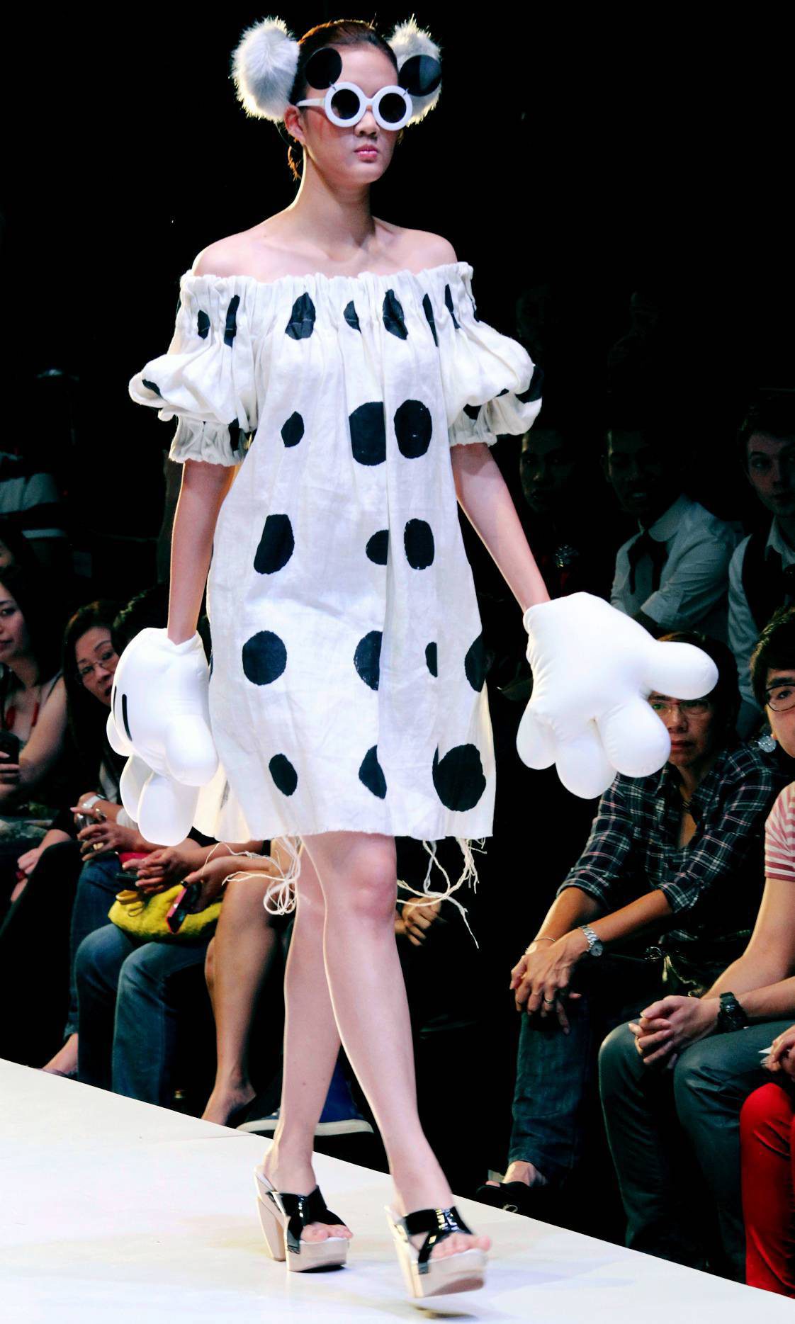 The whimsical collection inspired by Mickey and Minnie was complete with Mickey Mouse ears and hands, and the designer really went all out to make the models look like they walked right out of the cartoon and onto the runway.
