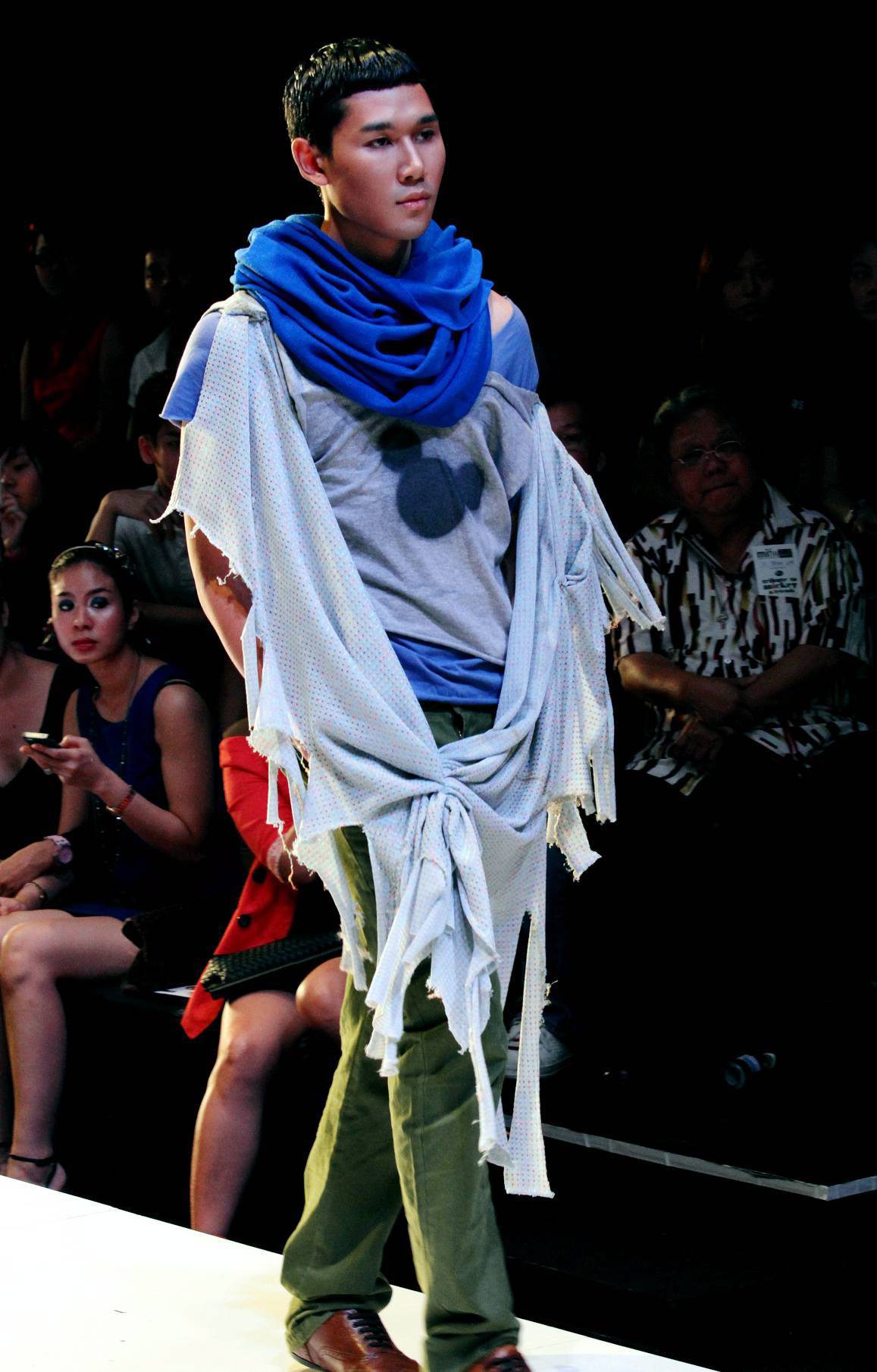 Using mainly dull greys, browns and greens, each piece was brought to life with bursts of bright colours and ripped hemlines – sort of like what a punk, or edgy fashionista Mickey would wear if he were real.