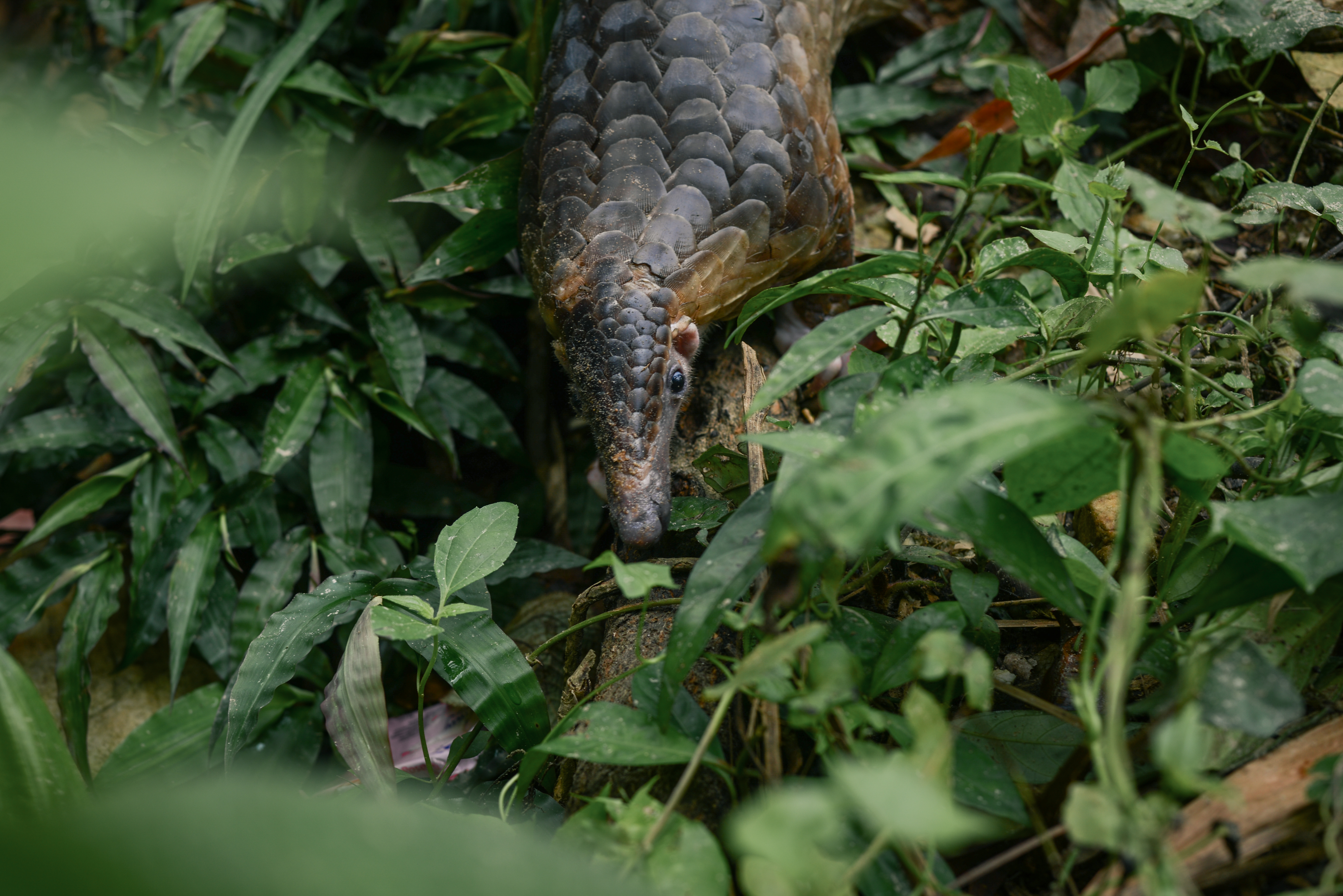 The moment the pangolin clambers into the forest, the rain pours down. So we name her Rainie.