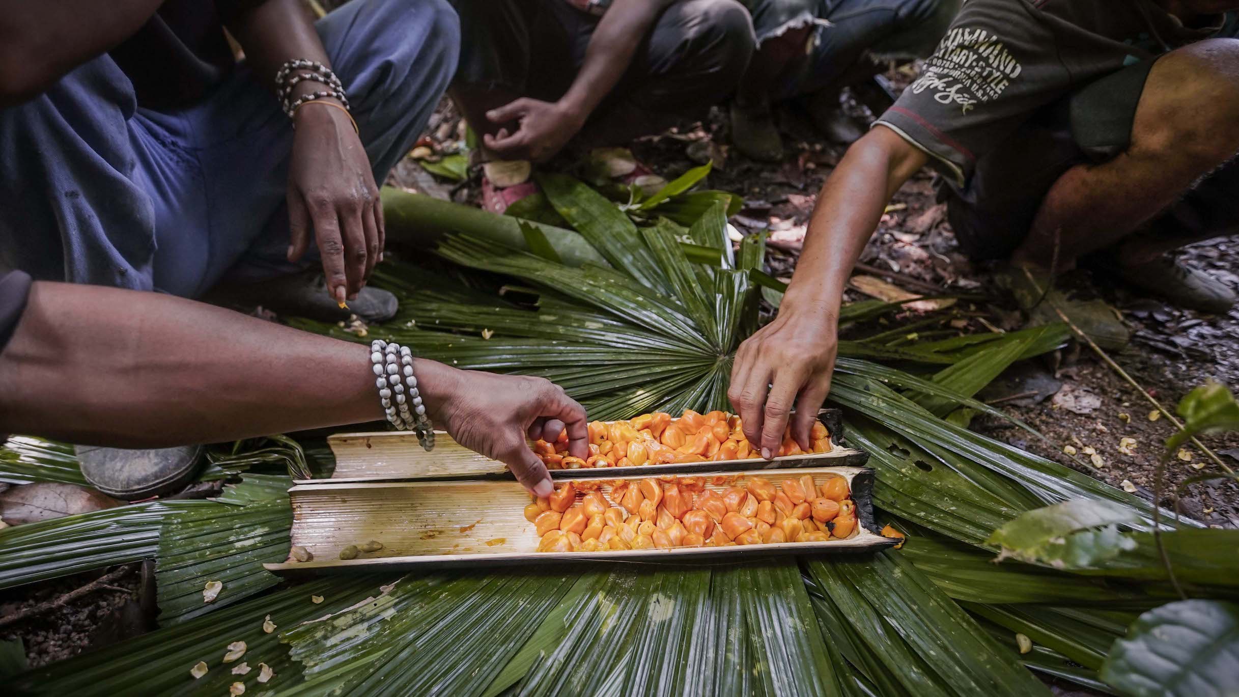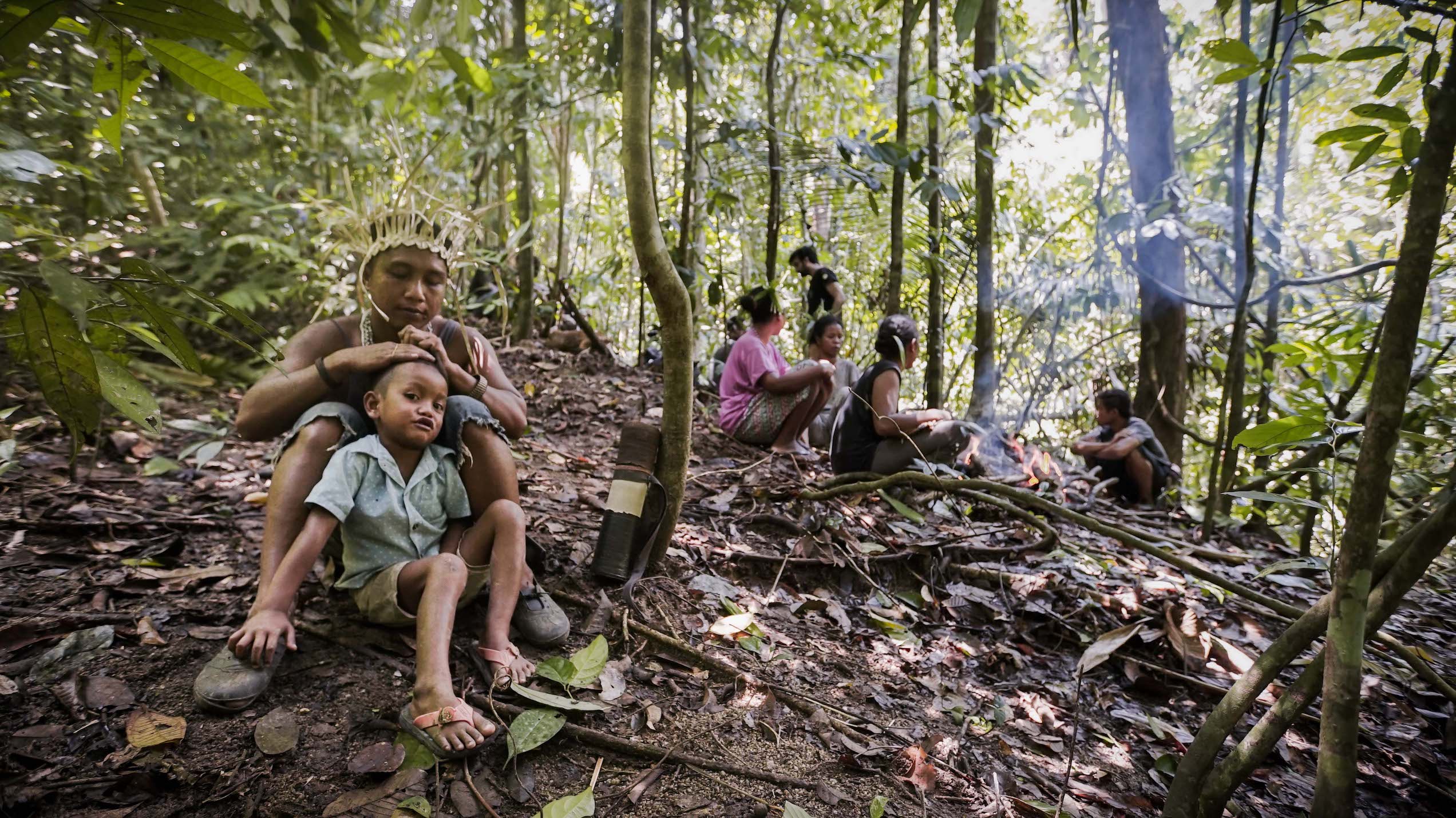 Back at their village, a small hamlet on a low rise among towering rainforest trees, we share a meal of forest squirrel and tapioca with our hosts in one of their bamboo huts. They are still in high spirits, while we are aching with fatigue after half a day hunting and foraging with them.