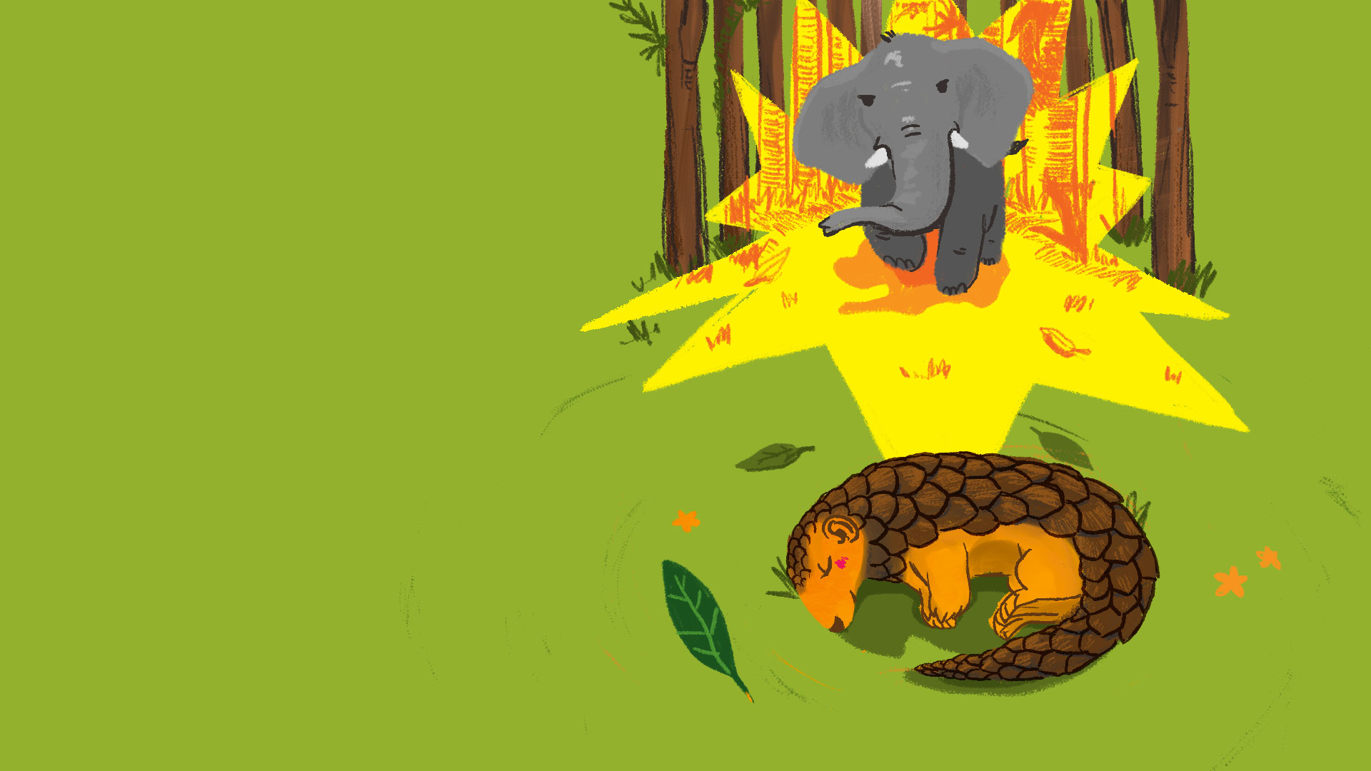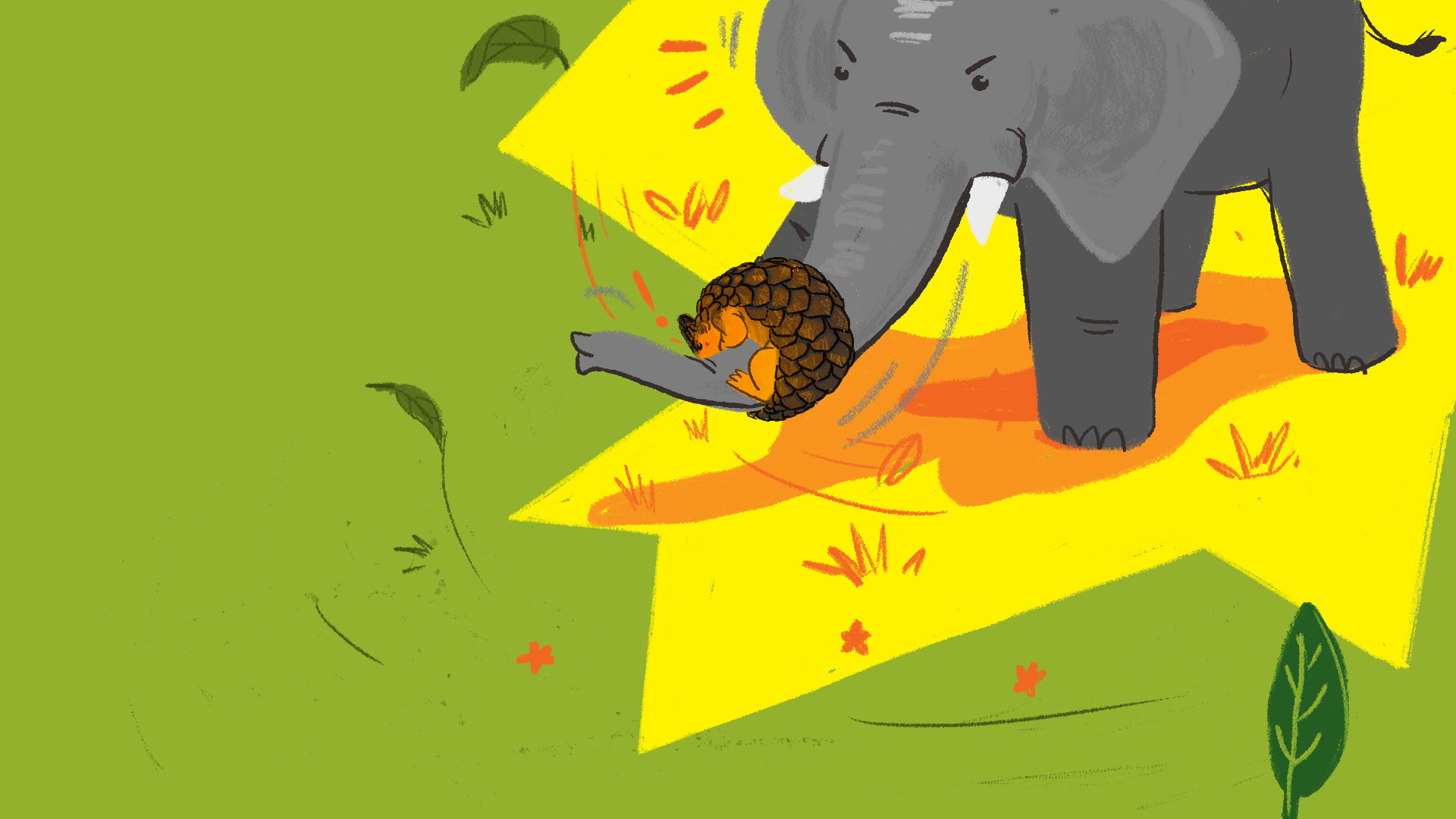 But just as his trunk touches the pangolin, the pangolin wakes with a start, and in a fit of fear curls his body around the elephant’s trunk. Now it is the elephant’s turn to be startled.