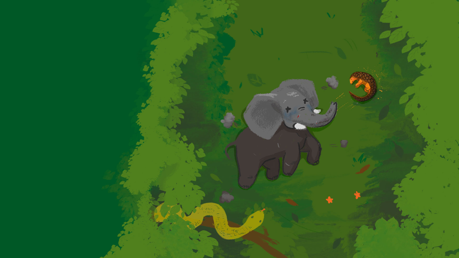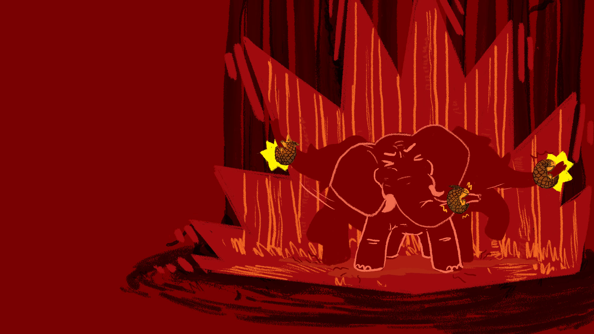 Tighter and tighter, until the elephant cannot breathe because his trunk is squeezed shut. The elephant thrashes and swings, crashing against tree trunks, but the pangolin never lets go.
