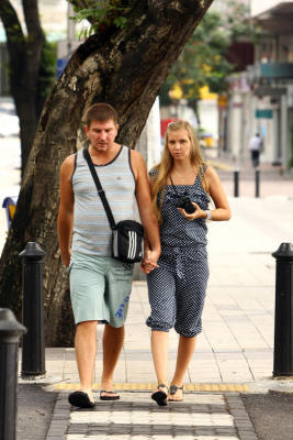 A couple holding hands as they strolled along the streets of KL.