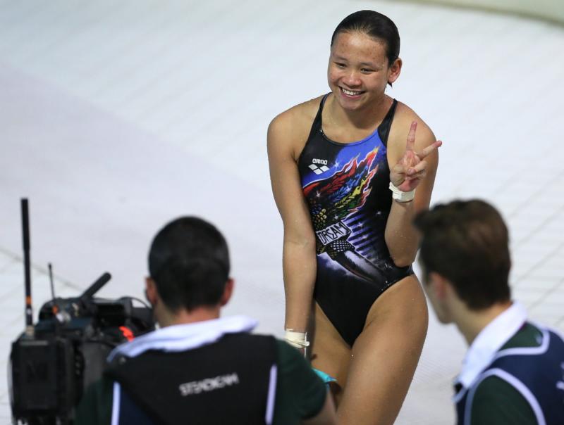 Malaysian diver Pandelela Rinong smiling to the live camera after competing in women's 10m platform prelimanary round at Aquatics Centre recently.