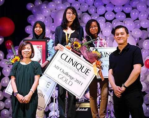 Clinique brand general manager Sharyn Wong (L) and Canon Marketing (Malaysia) Sdn Bhd Imaging Communication Product Division director Simon Wong (R) presenting the winners’ medals for the MY Challenge Photography category to Ashifah Muchlis (bronze), Ilsa Ameera Mohamad Harun (gold) and Nor’ain Mohd Nor (silver).