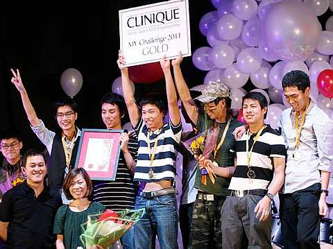 The Short Film category gold medallists from SM Sri KDU take centre stage during the MY Challenge grand finals. Presenting their awards are Canon Marketing (Malaysia) Sdn Bhd Imaging Communications Product Division director Simon Wong (front, left) and Clinique brand general manager Sharyn Wong (front, second left).