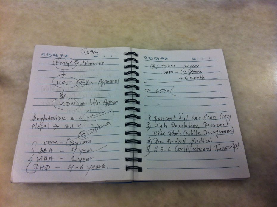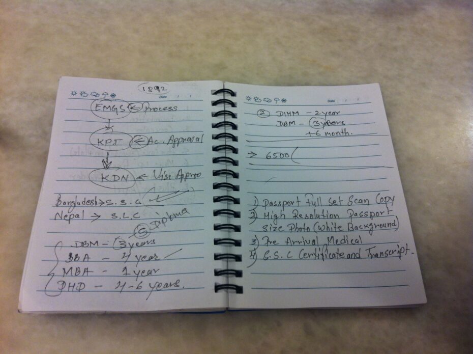 “I brought in 8,000 students from Bangladesh,” the agent boasts. “3,500 was under ___ College, 2,500 under ____ College, and 1,500 under ________ Language Centre.” Since when? “Since 2013.” The agent is thick set, clearly non-Malaysian, with what seems to be a large scar under his left eye. His hands are stocked with expensive-looking rings and a gold watch. He claims to represent ___ College, a well-known college operating from a mall in the heart of Kuala Lumpur. Through further undercover work, we verified that he indeed works from an office within the college, and staff members refer to him for matters related to international students.