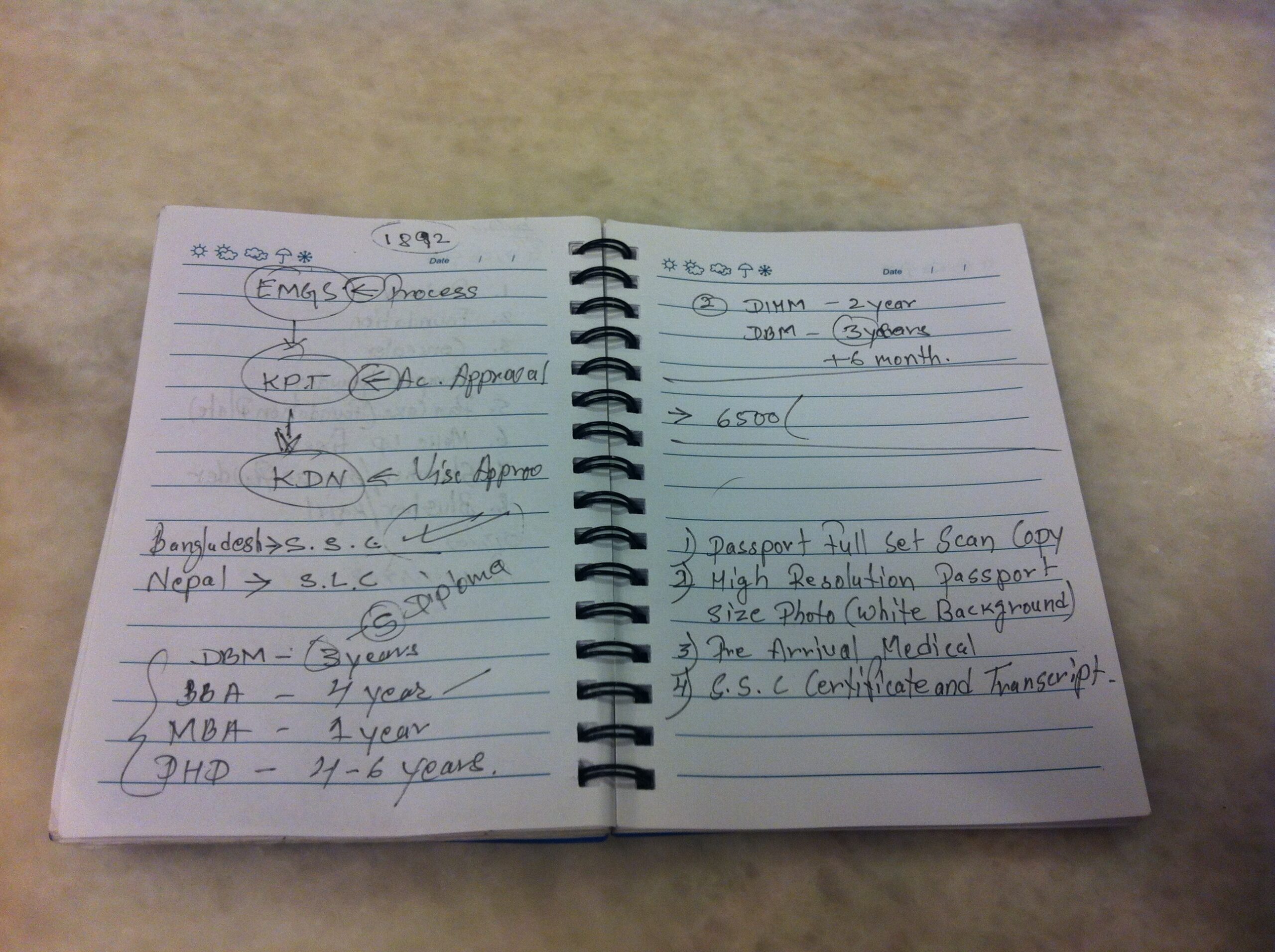 He tells us that 98% of the students are here as cheap labour, not to study. The agent continues to sell his services by telling us that class attendance can be faked for “a few hundred ringgit” to avoid problems with the Immigration Department.