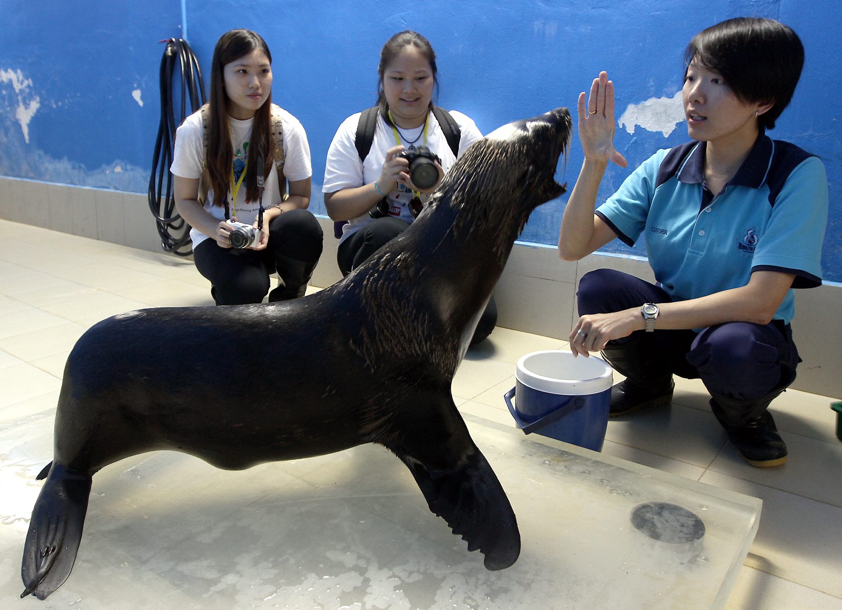 Students Loke Elaine (left), 18 and Tan Jo Anne (second from left), 16, were among the BRATS Langkawi participants who went behind the scenes at Underwater World Langkawi, where they delved into the world of zookepers,seals and penguins. Here, zookeeper Tan Gin Lui demonstrates how well trained seal is.