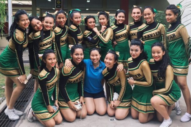 YouTube stars and CHEER Celebrity Supporters Reuben Kang, Marianne Tan and Jared Lee attempt a stunt while hanging out with the Dynamitez cheerleaders.