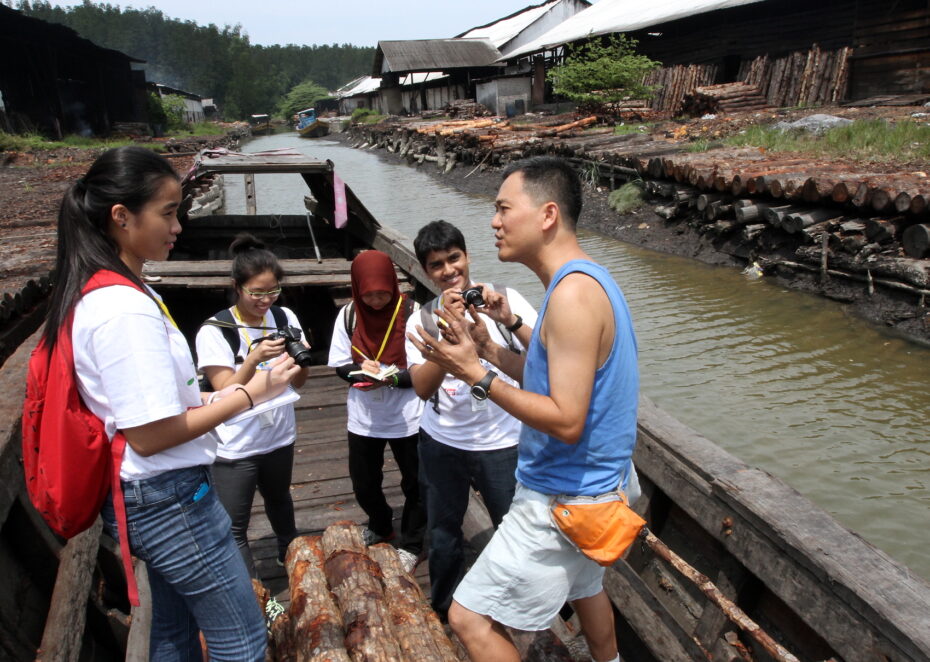 Playing it coal: Chuah Kee Yong, a member of the third generation of his family to be involved in traditional charcoal-making, showing the BRATs how mangrove trees are transported to his factory in Kuala Sepetang through a canal that fills up during high tide.